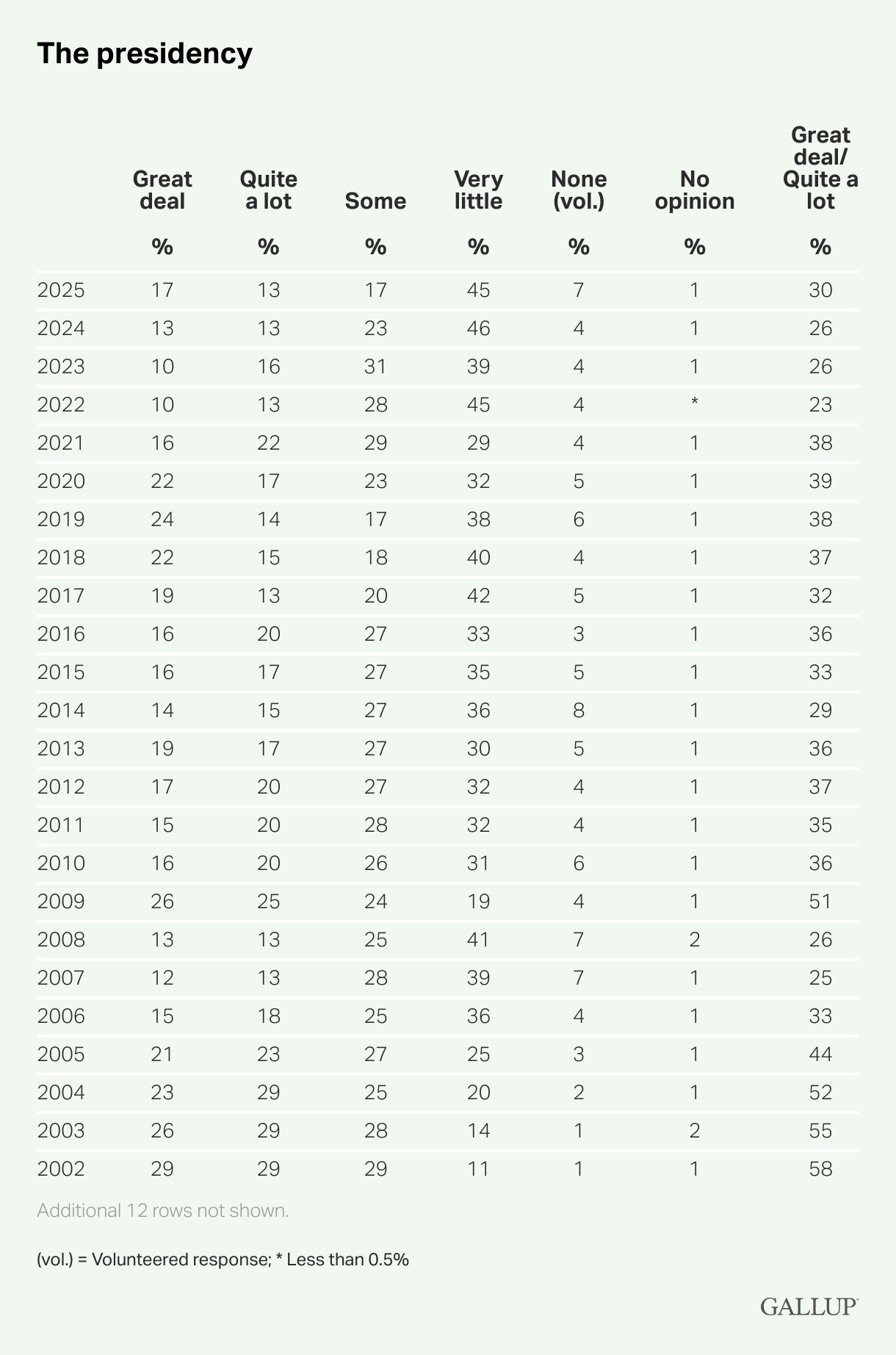 Gallup’s survey of American’s confidence in its pillar institutions shows American distrust at alarming levels across the board. While newspapers and tv news suffer low single-digit level (5-6%) of great deal of confidence, Congress is even lower at just 4%. The lack of confidence in the Presidency is the highest it’s been the last two years than in Gallup’s polling on the question.