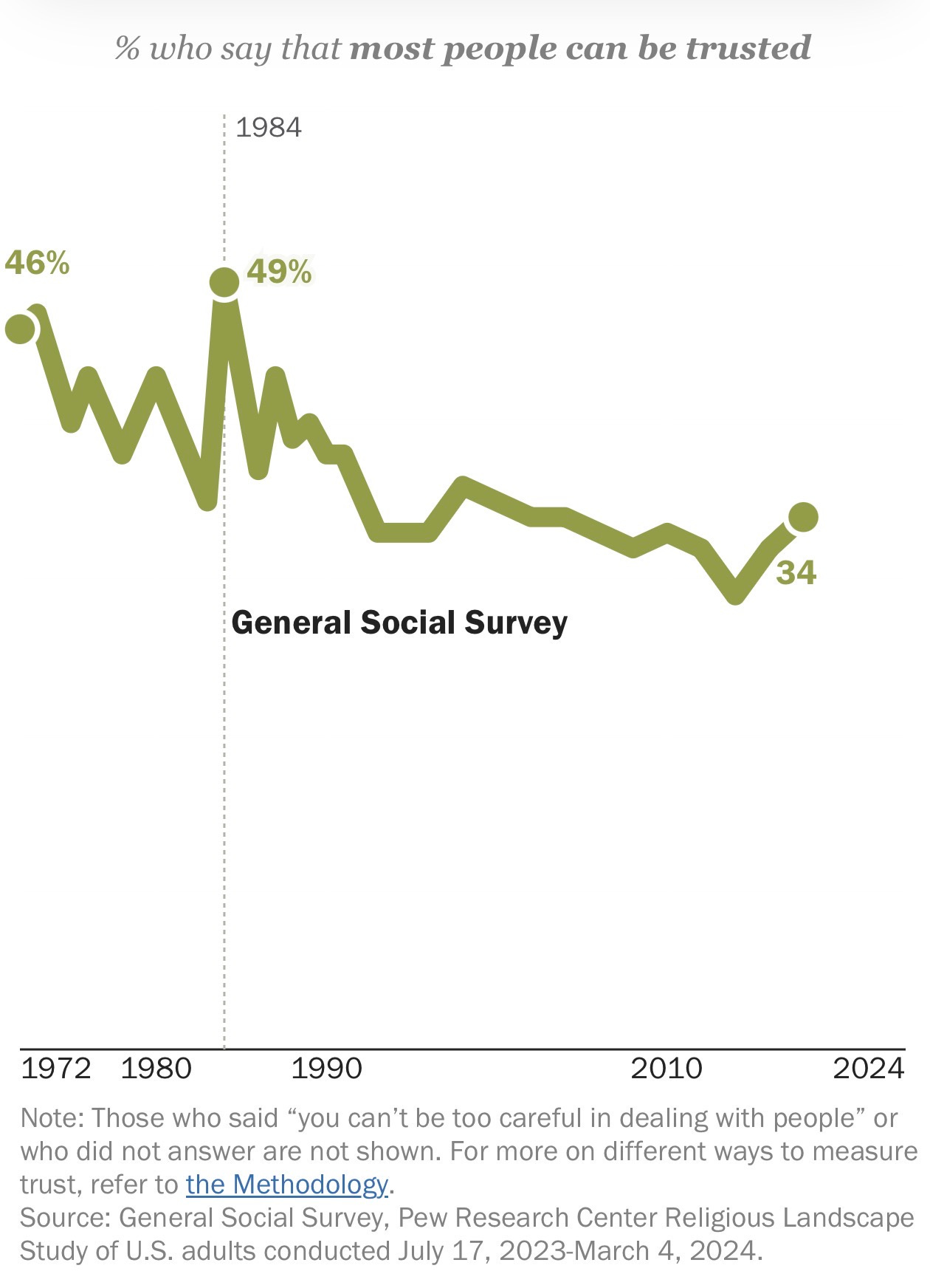 And as that foundation splinters, an even more disturbing fault line is emerging. Last Spring, Pew Research published a report on American’s Trust in One Another and in similar fashion that too is eroding.
